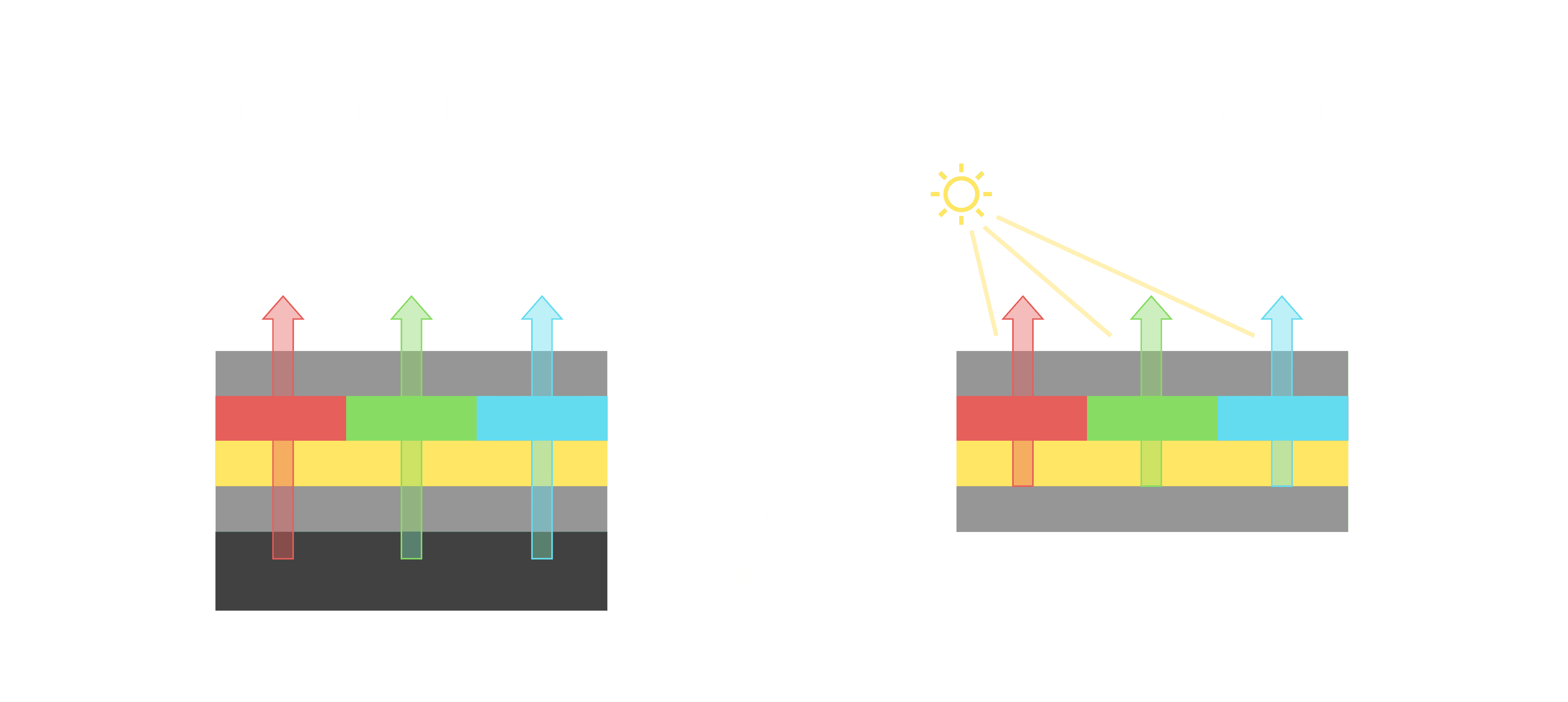 与传统需搭配背光单元的液晶显示相比,,,反射式液晶技术不仅更省电、、更轻薄,,且即便在艳阳下仍能清晰显示。。。。此外,,,,少了背光单元,,,,也大幅降低了 LED 蓝光伤害眼睛的疑虑。。